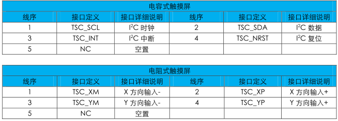 當使用CN3接口時,用戶板卡觸摸控制接口與CN4對應相連才能實現觸摸控制。EAC-LCD70L兩種觸摸屏對應的CN4接口定義如下表,用戶需要根據模塊所用的觸摸屏類型對應接口定義。
