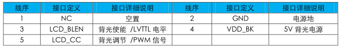 背光控制引線可通過CN3與用戶板卡相連,可以通過獨立接口CN5與板卡相連,用戶可根據自己的開發硬件平臺自行選擇,CN5引腳定義如下表: