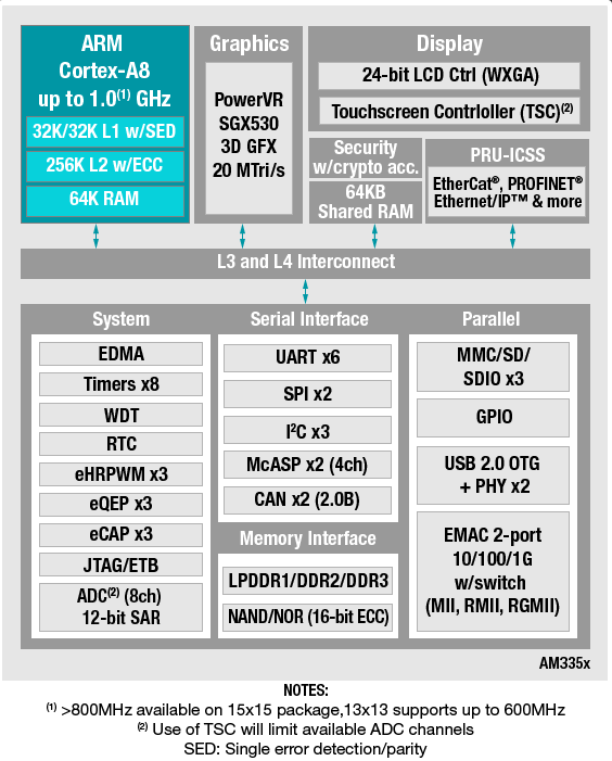 1. AM335X是275-MHz, 500-MHz, 600-MHz, or 720-MHz ARM Cortex-A8,32位 RISC 微控制器NEON SIMD 協(xié)處理器具有單錯檢測(奇偶校驗)的 32KB/32KB L1 指令/數(shù)據(jù)高速緩存具有錯 誤 糾正碼 (ECC) 的256KB L2 高速緩存