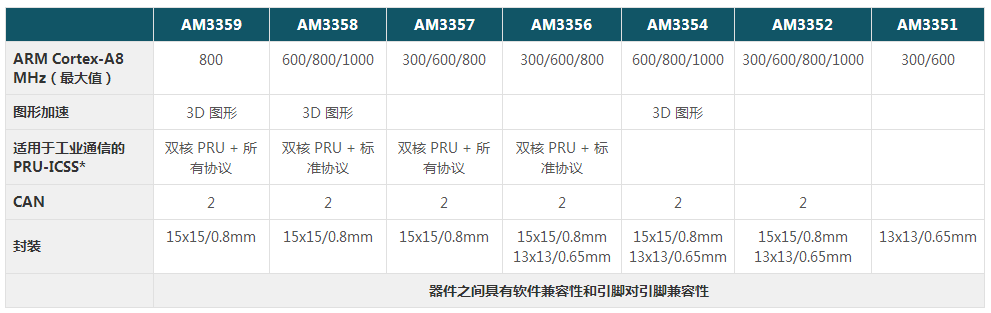 1.處理器采用系列化,從高端過渡到低端,滿足不同行業(yè)客戶的各種功能需求,達到性價比最優(yōu)的微妙平衡。分別有AM3359/AM3358/AM3357/AM3356/AM3354等多款配置參數(shù)各不相同的處理 器,且系列處理器管腳PIN對PIN兼容,方便客戶進行產(chǎn)品升級