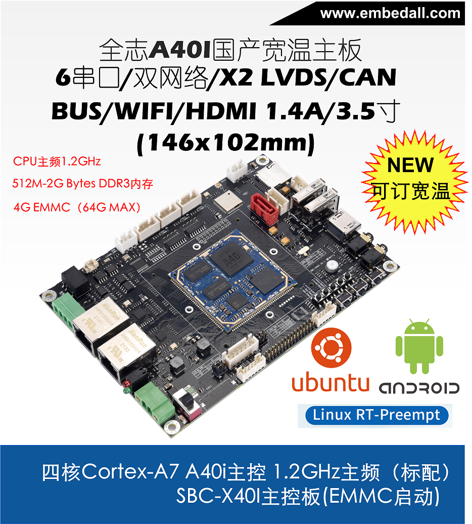 A40i為國產工控行業芯,是全志科技布局工控行業的重要產品,采用更低功耗的4核ARM Cortex-A7,工業品質100ppm,工作溫度范圍-40-85℃,是一款高性能低功耗超高性價比的行業應用處理器,支持Android&Linux雙系統,十年以上供貨周期。