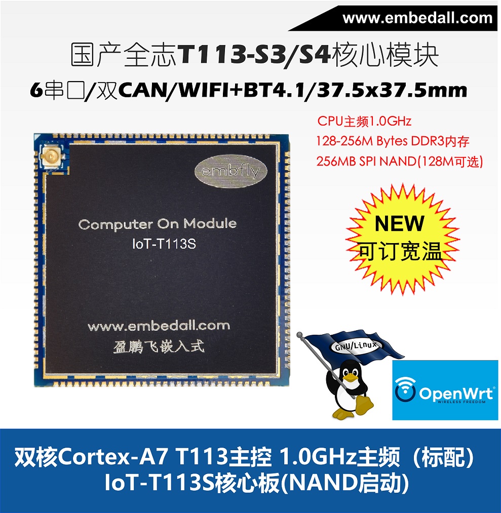 IoT-T113S屬于盈鵬飛嵌入式Computer-on-Module (CoM)系列,該產品集成了雙核 Cortex-A7 1.2GHz(MAX) T113-S3/S4處理器,穩定運行Linux 5.4/OpenWRT。 IoT-T113S提供了3.3V I/O接口,可提供寬溫的工業組件,運行于條件惡劣的工業現場!