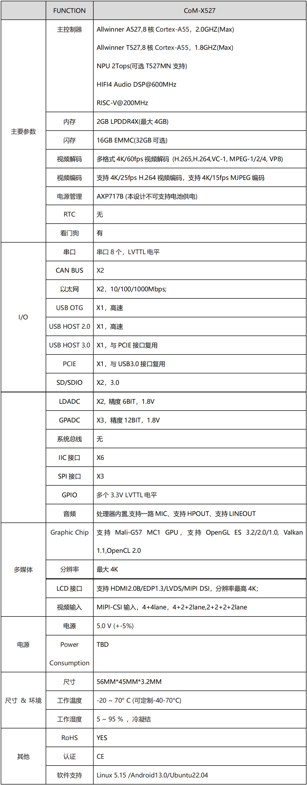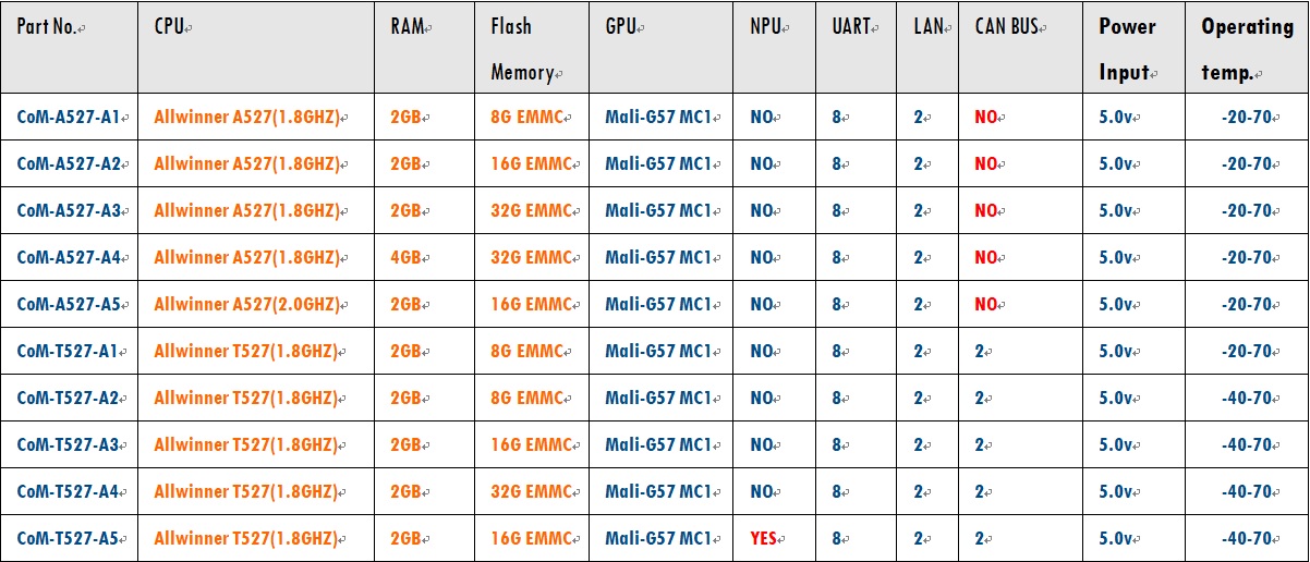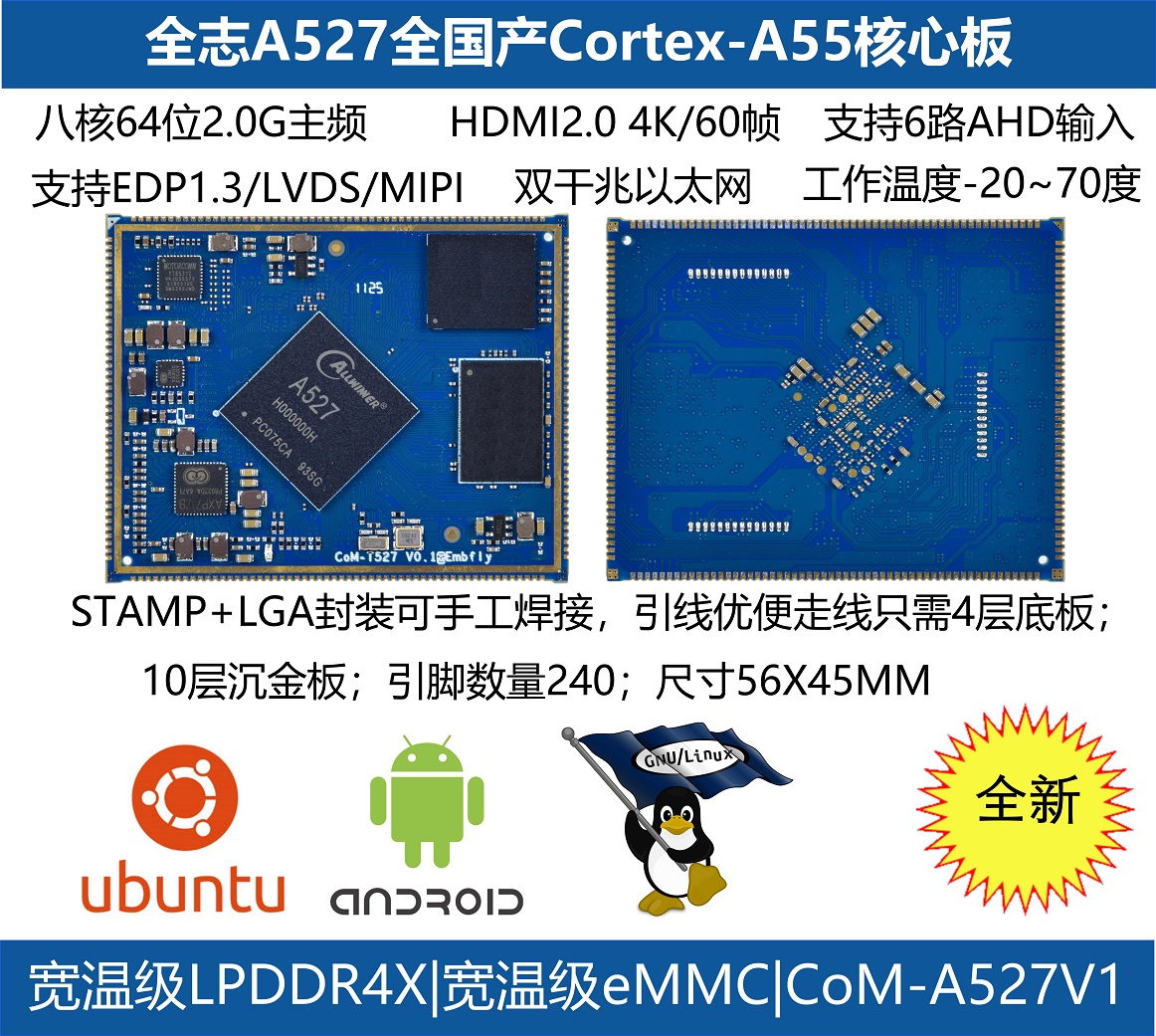 CoM-X527核心模塊屬于盈鵬飛嵌入式Computer-on-Module系列,該產(chǎn)品集成了八核 Cortex-A55 2.0GHz(MAX) A527處理器或者T527車(chē)規(guī)級(jí)處理器,穩(wěn)定運(yùn)行Android 13.0/Ubuntu 22.04/Linux 5.15。CoM-X527可提供雙千兆以太網(wǎng)接口;支持MIPI-CSI輸入,4+4lane,4+2+2lane,2+2+2+2lane;支持10路串口;支持HDMI2.0B/EDP1.3/LVDS/MIPI DSI顯示;特定型號(hào)還支持2TOPS的NPU, 為圖像處理及畫(huà)質(zhì)增強(qiáng)等AI應(yīng)用提供了性能支持;它還還提供了3.3V I/O接口,可提供寬溫的工業(yè)組件,運(yùn)行于條件惡劣的工業(yè)現(xiàn)場(chǎng)!該產(chǎn)品可應(yīng)用于智能座艙、輔助駕駛、智慧工業(yè)、行業(yè)智能、智能電網(wǎng)等領(lǐng)域,我司提供各種參考設(shè)計(jì)。