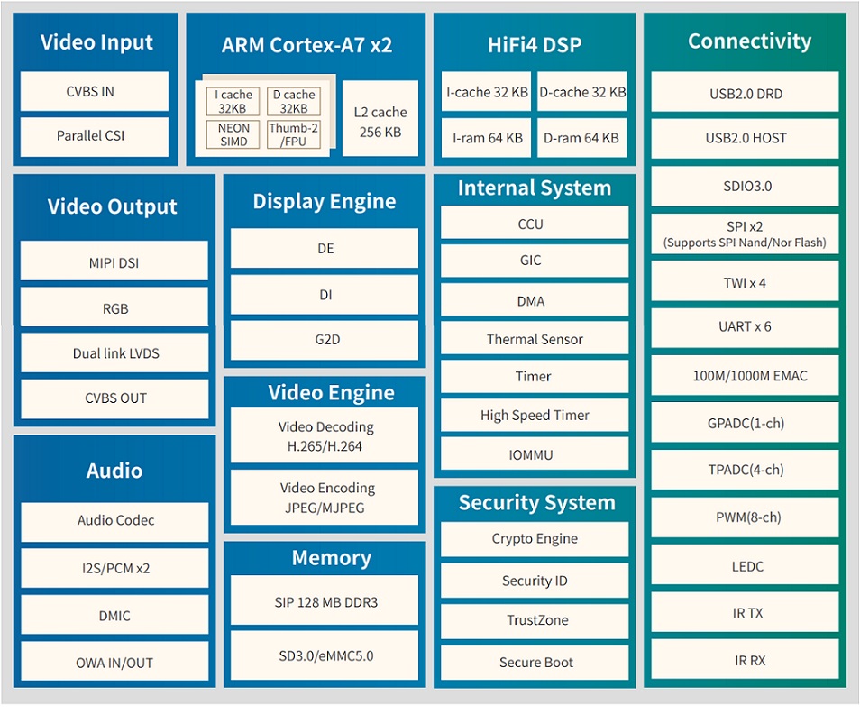 ●完美視頻體驗:集成了H.265/H.264 1080p@60fps解碼和SmartColor2.0后處理功能,T113-S3/S4為用戶提供一定的視頻娛樂體驗,讓每一幀充滿生動和細節。