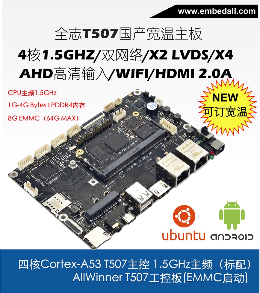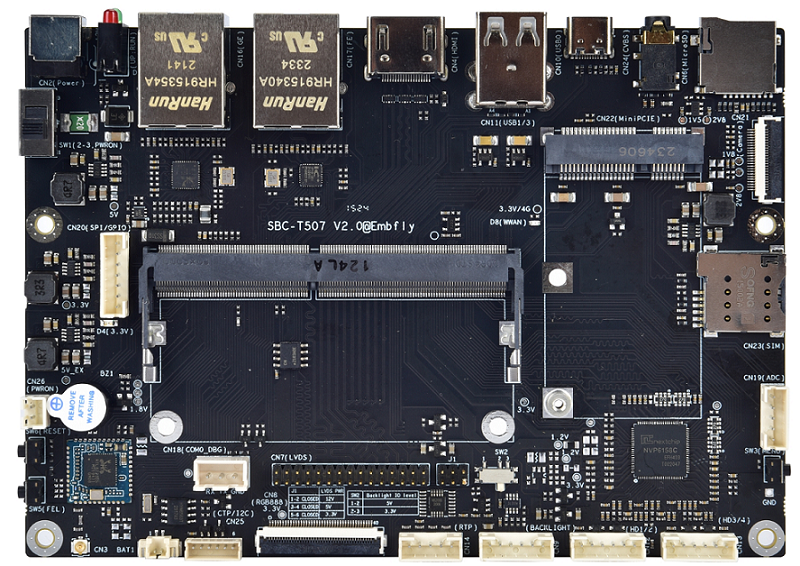 SBC-T507主板是DIM-T507V2.0核心模塊的工程底板的參考設(shè)計(jì),該產(chǎn)品集成了四核 Cortex-A53 1.5GHz(MAX) T507 處理器,穩(wěn)定運(yùn)行Android 10.0/Ubuntu 18.04/Linux 4.9。 SBC-T507提供了3.3V I/O接口,可提供寬溫的工業(yè)組件,運(yùn)行于條件惡劣的工業(yè)現(xiàn)場!