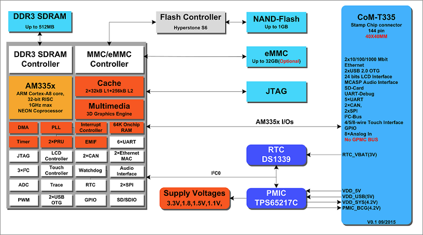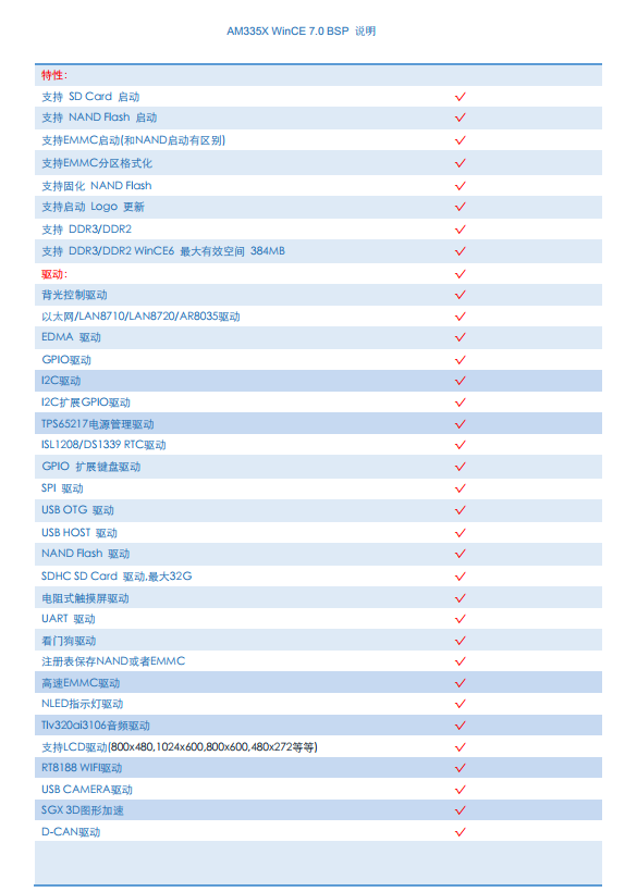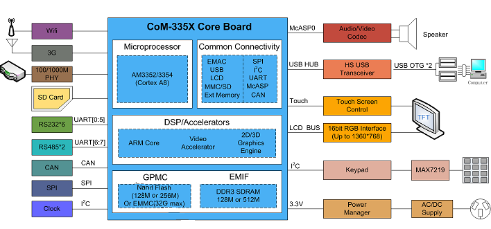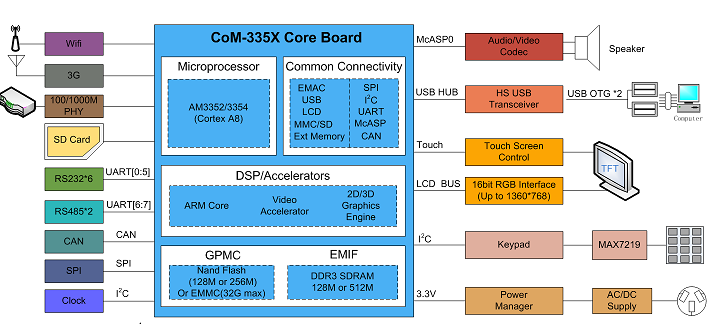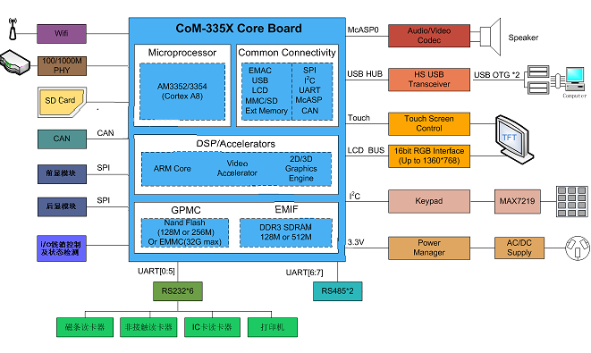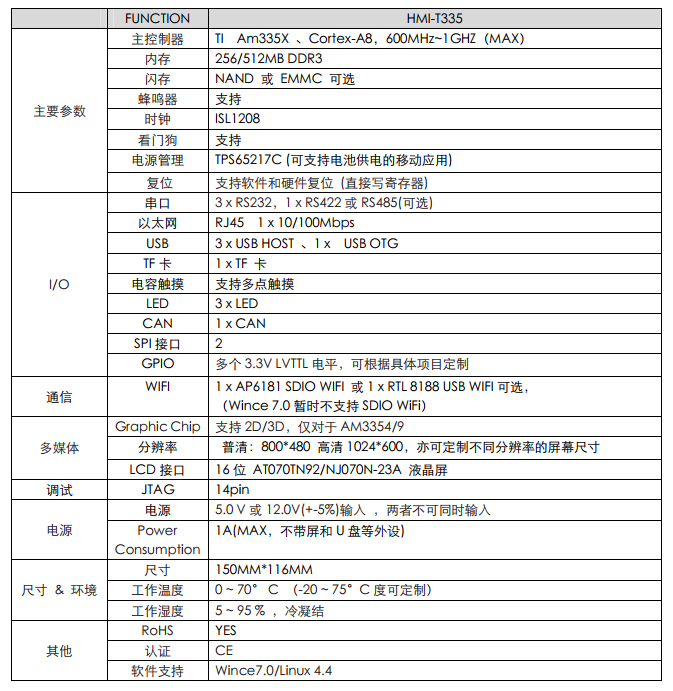 產(chǎn)品特性 1.采用TI公司Cortex-A8 AM335X作為主控,運(yùn)行速度高達(dá)1GHZ,工業(yè)級處理器,工作穩(wěn)定可靠。 2.啟動媒介可選EMMC或NAND,Wince7.0從上電到出現(xiàn)應(yīng)用程序可在15秒內(nèi)完成。 3.整體采用AM335x(CoM-T335 v1.1)核心模塊實現(xiàn),便于快速定制,最快可一個月實現(xiàn)應(yīng)用。 4.可提供Wince 7.0和linux 4.4兩套操作系統(tǒng),提供大量的應(yīng)用源代碼,例如:wince 7.0可提供C++、C#等例子,Linux例子程序有中文操作、串口操作、CAN BUS通信等... 5.實現(xiàn)穩(wěn)定的電容屏多點(diǎn)觸控,讓操作更流暢。 6.支持高清和普清兩款液晶屏,分辨率分別是1024*600和800*480, 客戶可以隨意選擇,亦可定制不同款液晶屏。 7.引出JTAG接口,可直接仿真單任務(wù)程序,讓客戶快速調(diào)試。 8.整個系統(tǒng)可根據(jù)用戶要求可隨意變換主板結(jié)構(gòu),可快速實現(xiàn)應(yīng)用,如需定制,可聯(lián)系email:info@embedall.com。 9.15年項目應(yīng)用定制經(jīng)驗,讓客戶更放心,更省心。 HMI-T335是基于AM335x(CoM-T335v1.1)核心模塊的人機(jī)界面(可定制寬溫)工控主板,穩(wěn)定運(yùn)行Wince7.0或Linux4.4系統(tǒng)。支持4串口(3路RS232、1路RS422或RS485)、CAN總線、電容屏多點(diǎn)觸摸、WIFI、JTAG、百兆以太網(wǎng)等??梢詮V泛用于控制現(xiàn)場、路橋控制收費(fèi)系統(tǒng)、醫(yī)療儀器、POS柜臺收銀機(jī)、數(shù)控機(jī)床、環(huán)境保護(hù)監(jiān)測等領(lǐng)域。 CoM-T335v1.1工控模塊產(chǎn)品集成了 ARM Cortex-A8 1GHz(MAX) TI AM335X 處理器,穩(wěn)定運(yùn)行Wince 7.0 和Linux 4.4。 CoM-T335v1.1提供了3.3V I/O接口,可定制寬溫的工業(yè)組件,運(yùn)行于條件惡劣的工業(yè)現(xiàn)場! 產(chǎn)品參數(shù) 功能框圖 支持軟件 Wince 7.0相關(guān)驅(qū)動 CoM-T335 v1.1亮點(diǎn) Cortex-A8郵票孔AM335X核心模塊,精設(shè)計,低成本,可信賴 ◆ 高速Cortex-A8核心,最高運(yùn)行1GHZ; ◆ 單顆256M/512M字節(jié)DDR3 SDRAM,成本更低廉; ◆ 大容量板載電子盤,更多用戶空間; ◆ 精致郵票孔設(shè)計,超小尺寸40mm*40mm,批量使用成本更低; ◆ 1路10M/100M/1000M以太網(wǎng); ◆ 核心板獨(dú)立RTC, 走時精準(zhǔn); ◆ 最優(yōu)秀的顯示性能,分辨率高達(dá)1366*768; ◆ CPU內(nèi)置6路RS232串口(其中1路232為COM_DBU); ◆ 外部擴(kuò)展3*IIC,2*SPI接口; ◆ CPU內(nèi)置雙路CAN BUS,適合于現(xiàn)場工業(yè)控制; ◆ 支持SD卡接口,大容量存儲; ◆ 高速USB 2.0 OTG接口; ◆引出JTAG接口(V1.1版本硬件,4線電阻觸摸屏),便于裸機(jī)系統(tǒng)調(diào)試。 ◆EMMC啟動版本兼容BeagleboneBlack。 ◆ 專業(yè)WINCE 7.0、LINUX 4.4、ANDROID操作系統(tǒng)支持, ◆支持SD卡初始化系統(tǒng),可USB盤升級系統(tǒng); ◆ 核心板高集成度,可以直接應(yīng)用,可根據(jù)客戶定制主板; AM335x框圖 CoM-T335v1.1實物圖 CoM-T335v1.1尺寸(40mm x 40mm) CoM-T335v1.1應(yīng)用領(lǐng)域: 應(yīng)用案例1-POS機(jī) 應(yīng)用案例2-監(jiān)護(hù)儀 應(yīng)用案例3-人機(jī)界面 AM335x人機(jī)界面解決方案